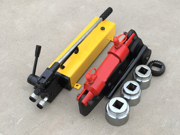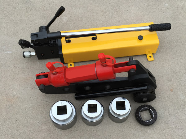 手動高壓泵由操縱手柄,高壓泵、換向閥、油箱、壓力表和帶快速接頭的輸油管等組成。帶棘輪式液壓扳手由高壓油口、液壓油缸、曲柄、反力桿、棘輪裝置、套筒等組成、前者系動力源部件,后者為扭矩執行機構。